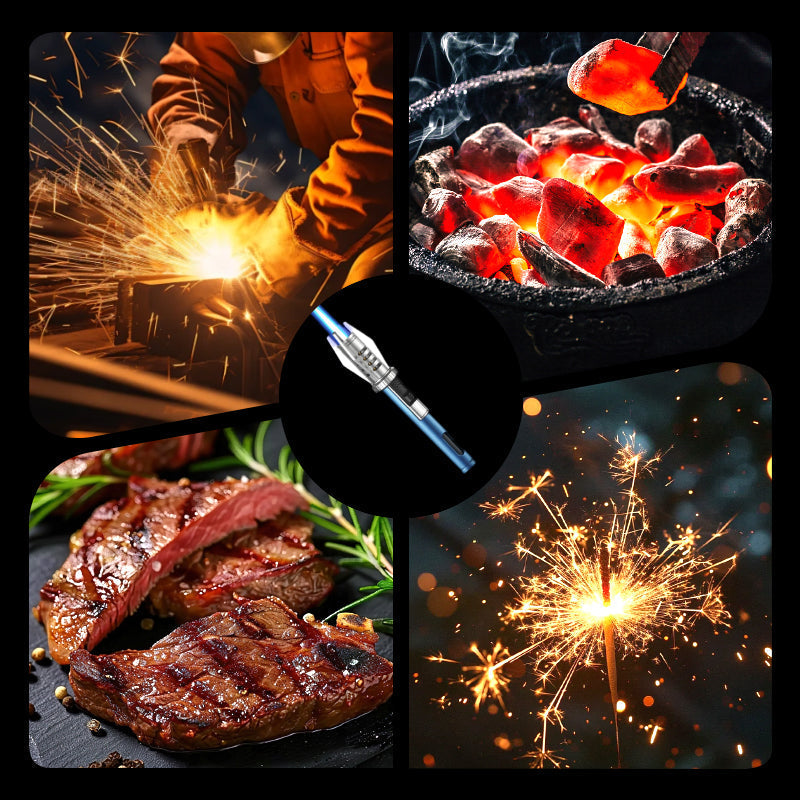 IGNITION AT ANY ANGLE & ADJUSTABLE FLAME – This lighter can be used upside down at a 360° angle, supporting ignition from any position. The adjustable flame button located at the bottom of the unit allows precise control, ranging from a gentle spark to a strong jet flame. It is suitable for a variety of scenarios, such as lighting cigars, charcoal, or for use in gourmet cooking and more.